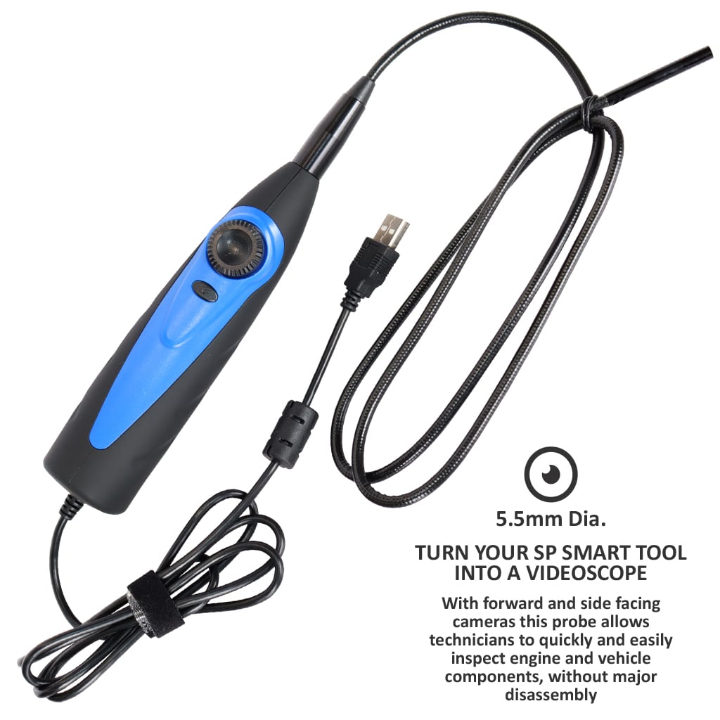 With forward and side facing cameras this probe allows technicians to quickly and easily inspect engine and vehicle components, without major disassembly.